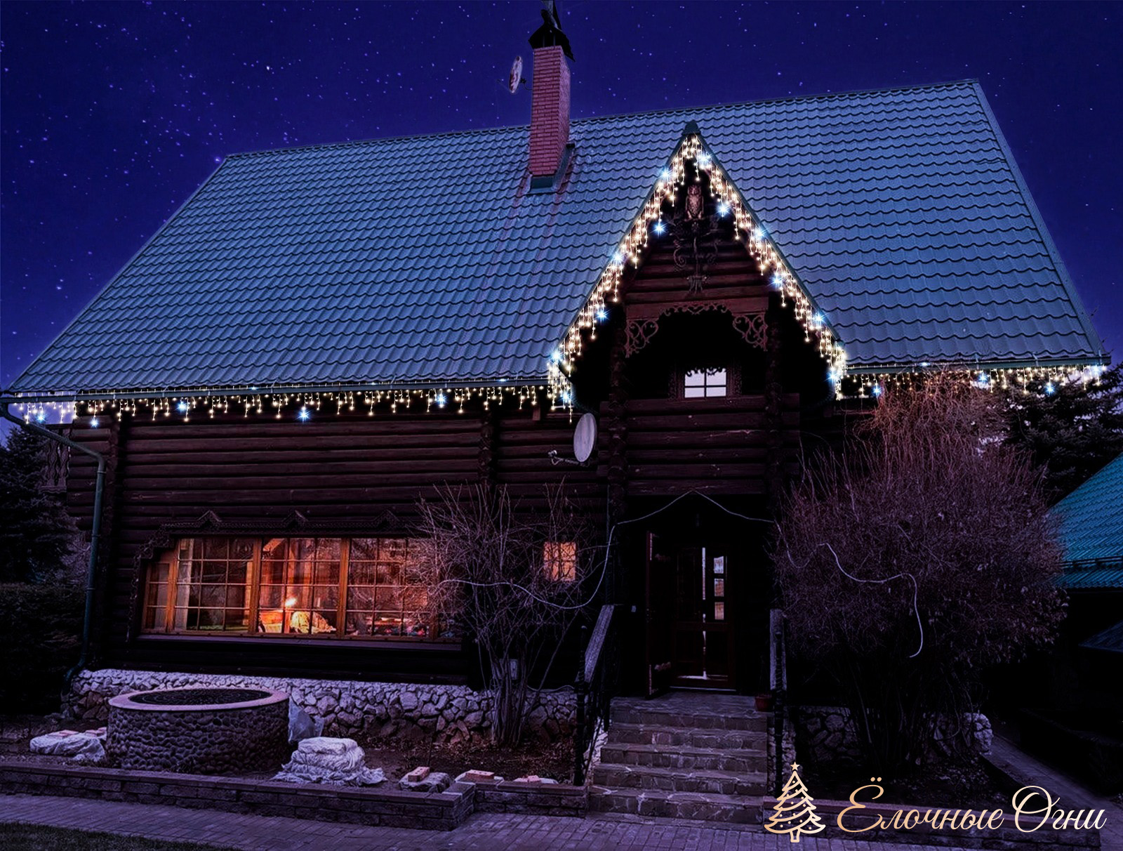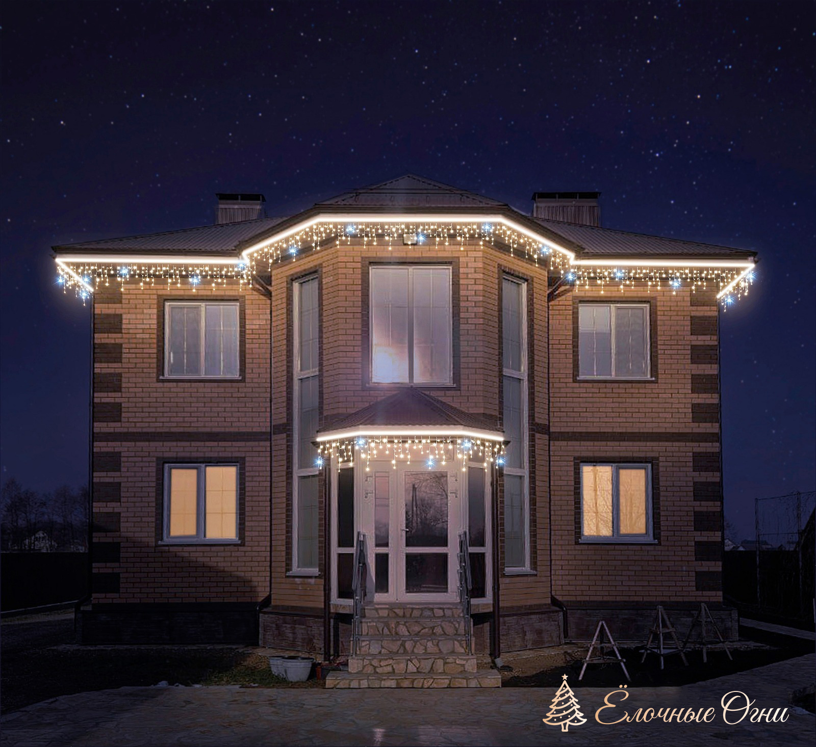 Комплексное использование Бахромы и Нити превращает фасад в живописное сияние. Мягкий свет бахромы добавляет уют, а мерцание нитей создает атмосферу волшебства, погружая дом в праздничное настроение и делая его центром притяжения на зимнем фоне.